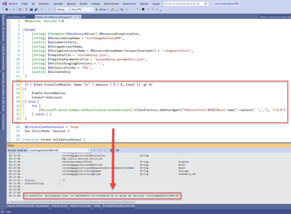 Lo que hace VS2019 es ejecutar el fichero Deploy-AzureResourceGroup.ps que contiene el código en Azure Powershell ARM por lo que el resultado será que se producirá el error ya comentado puesto que no reconocerá los cmdlets.