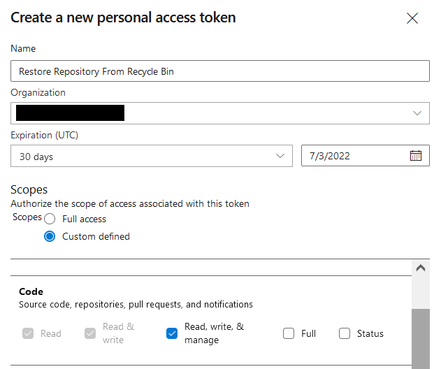 1. Primero debemos crear un token que usaremos para autenticar en Azure DevOps desde Postman. Nos aseguramos de proporcionar el alcance y la fecha de caducidad adecuados al crear el token.